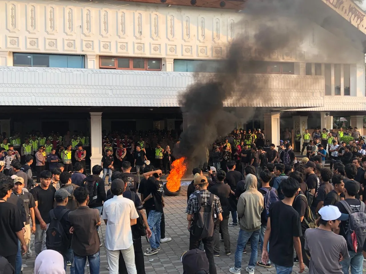 Dalam aksi ini terlihat aksi saling dorong antara massa dan aparat pengamanan. Mereka meminta untuk memasuki gedung DPRA namun tidak terpenuhi hungga berujung aksi bakar ban di halaman DPRA.