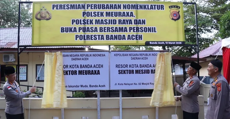 Perubahan nomenklatur tersebut, kata dia, berdasarkan Surat Telegram Kapolda Aceh Nomor ST/116/II/KEP.3/2026 tanggal 26 Februari 2026. Dalam surat tersebut disebutkan perubahan nama Polsek Ulee Lheue menjadi Polsek Meuraxa serta Polsek Krueng Raya menjadi Polsek Mesjid Raya.